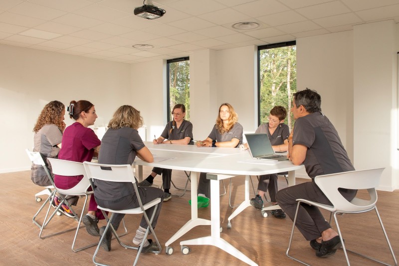 C'est une équipe de 40 personnes jeunes et très impliquées, composée de spécialistes ECVIM,ECVDI,DESV chirurgie, 3 CEAV, 2 CES hémato-biochimie, DE de comportement, 1 agrégé de reproduction et d’assistantes spécialisées dans les différents domaines.