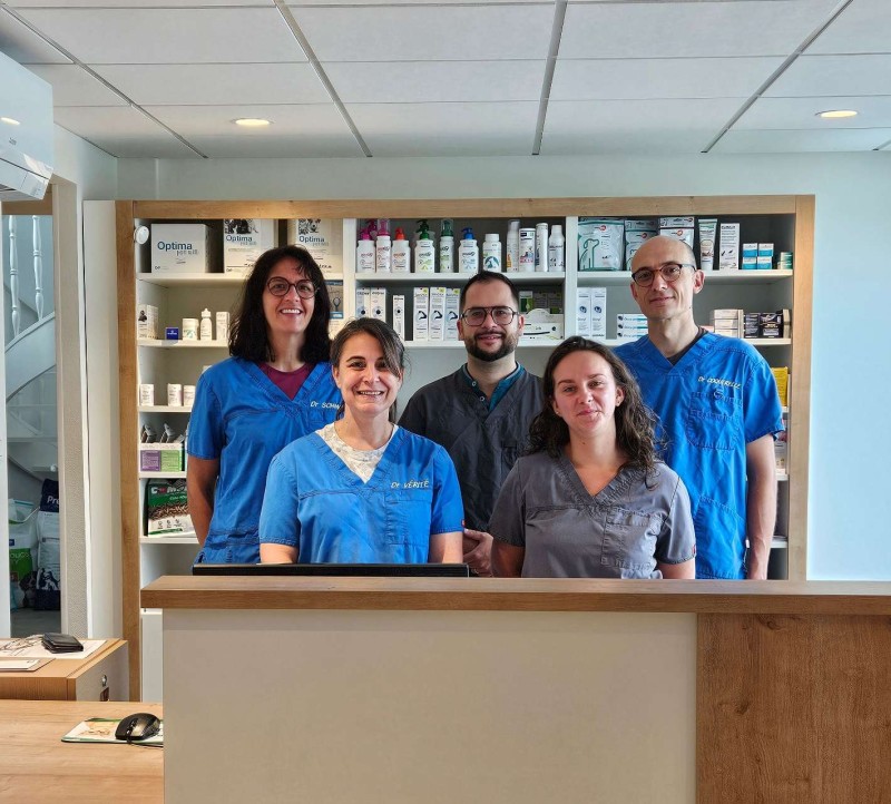 L’équipe se compose de 3 vétérinaires, dont un CEAV de médecine interne et un DE d’ophtalmologie, et de 3 auxiliaires.