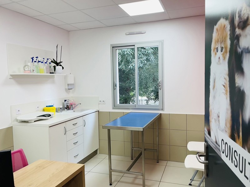 4 salles de consultation, 1 salle de chirurgie, chenil, chatterie et espace dédié aux contagieux.