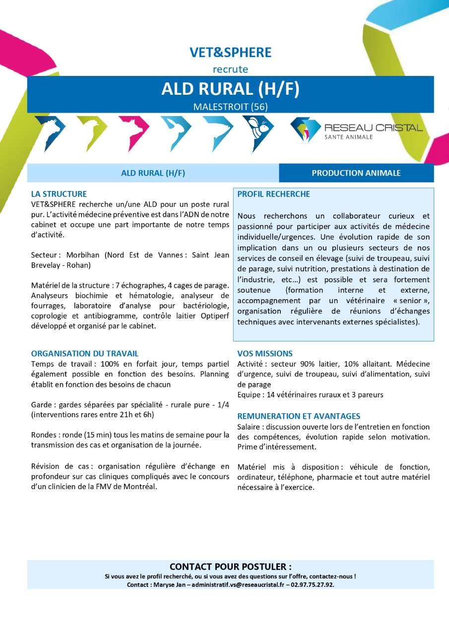 la SELARL VET&SPHÈRE, site de Saint-Marcel (56) recherche un/une ALD pour un poste rural pur.