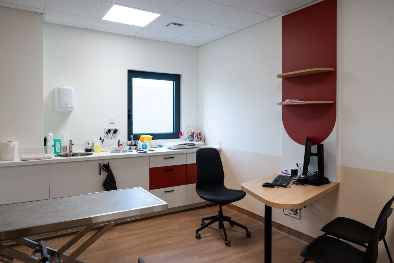 5 salles de consultation chat, 5 salles de consultation chien, 1 salle de fin de vie, 1 salle de visite adjacente à l’espace d’hospitalisation, 1 salle de physiothérapie, 1 salle de chimiothérapie avec espace extérieur dédié, 3 salles de consultation d’urgence, 3 blocs chirurgicaux adaptés, 1 salle d’endoscopie, hospitalisation chatterie/chenil/NAC,