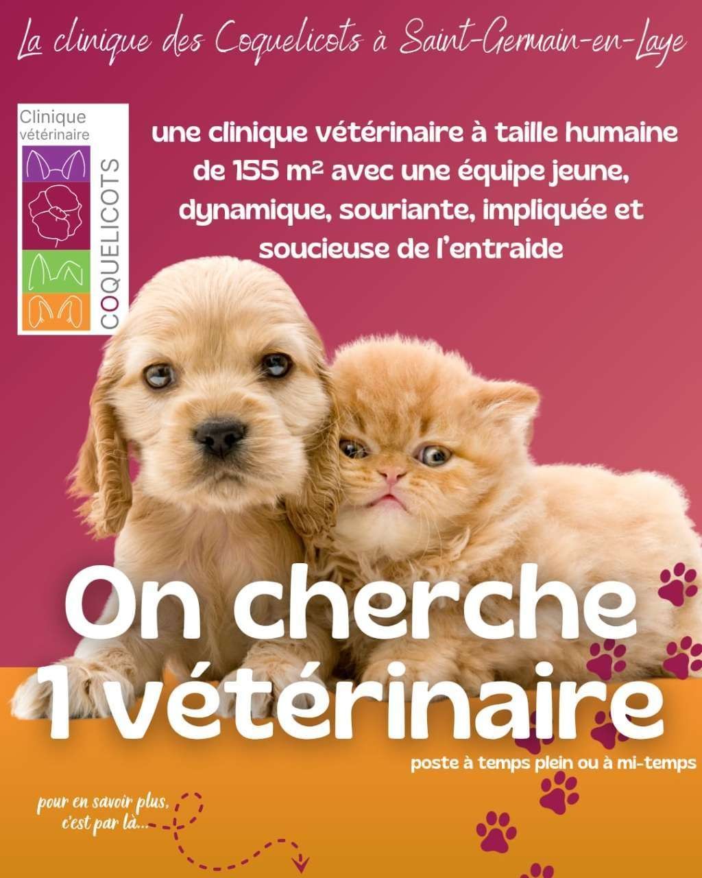 La Clinique Vétérinaire des Coquelicots , située en centre ville de Saint-Germain-en-Laye, proche des restaurants et commerces, recrute deux vétérinaires pour compléter son équipe dynamique et engagée !