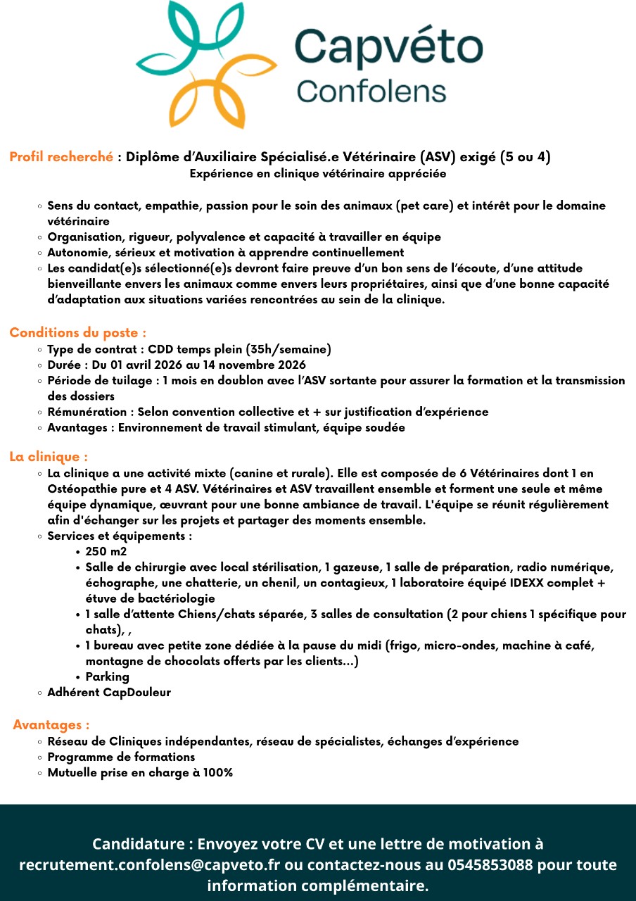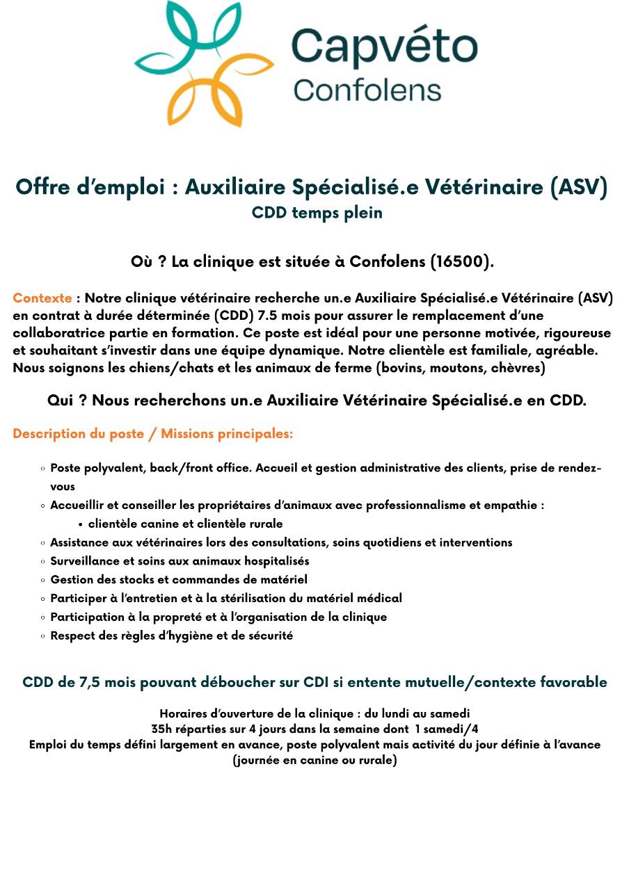 Notre clinique vétérinaire recherche un ou une Auxiliaire Spécialisé(e) Vétérinaire (ASV) mixte en contrat temps plein à durée déterminée (CDD) 7.5 mois pour assurer le remplacement d’une collaboratrice partie en formation. Ce poste est idéal pour une personne motivée, rigoureuse et souhaitant s’investir dans une équipe dynamique. Notre clientèle est familiale, agréable.