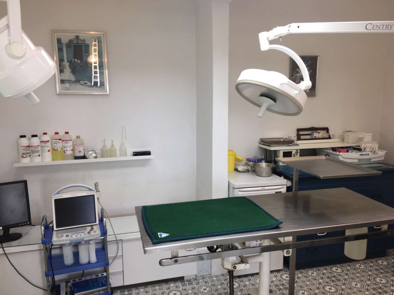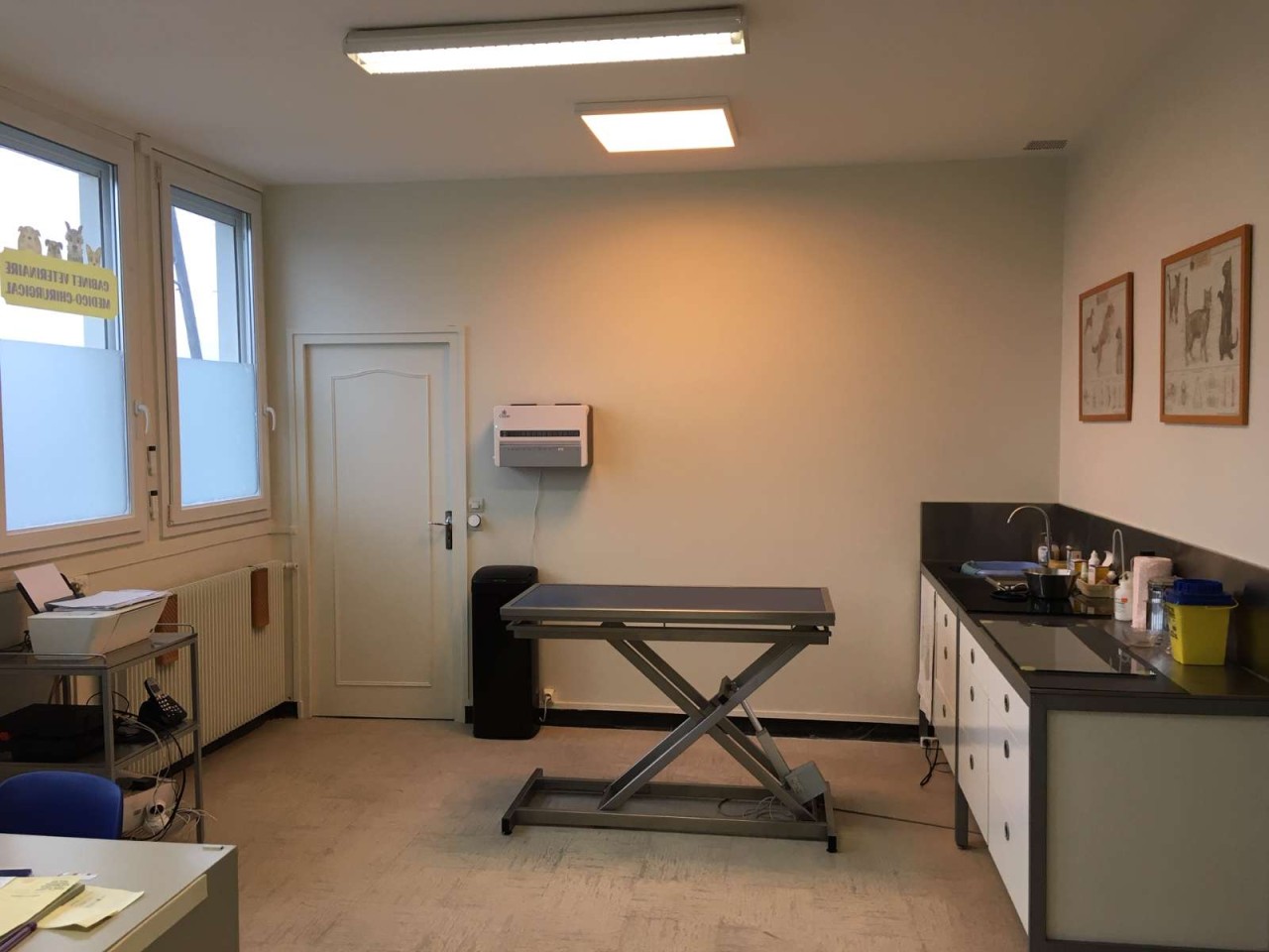 Matériel : tables consultation et chirurgie, radio Intech ( capteur plan à acquérir si nécessaire ), Vetscan2, écho Minray, concentrateur O2, 2 scialytiques et cages inox.