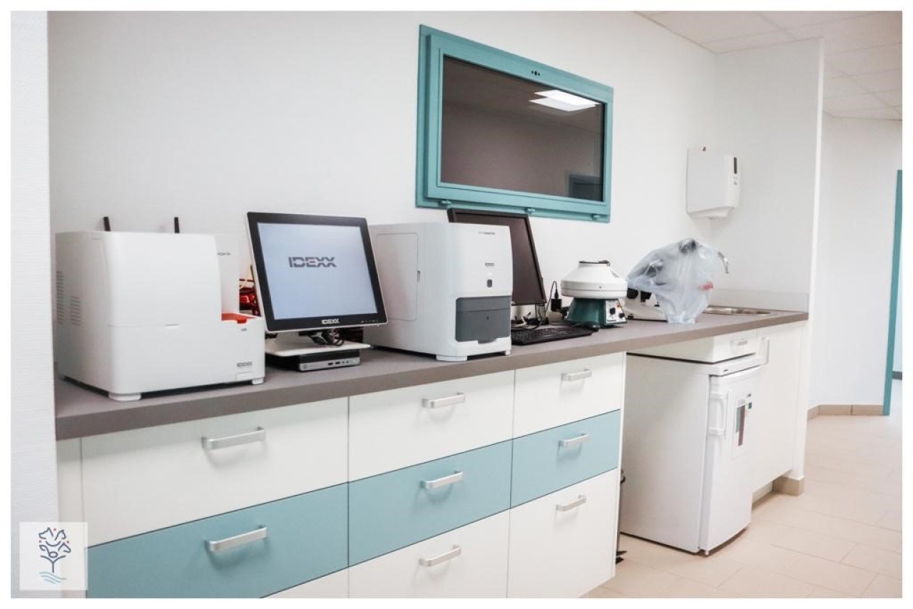 - Laboratoire complet (microscope, analyseurs IDEXX : Procyte One pour la NF, Catalyst one pour la biochimie, Sedivue, Coag Dx, Invue)