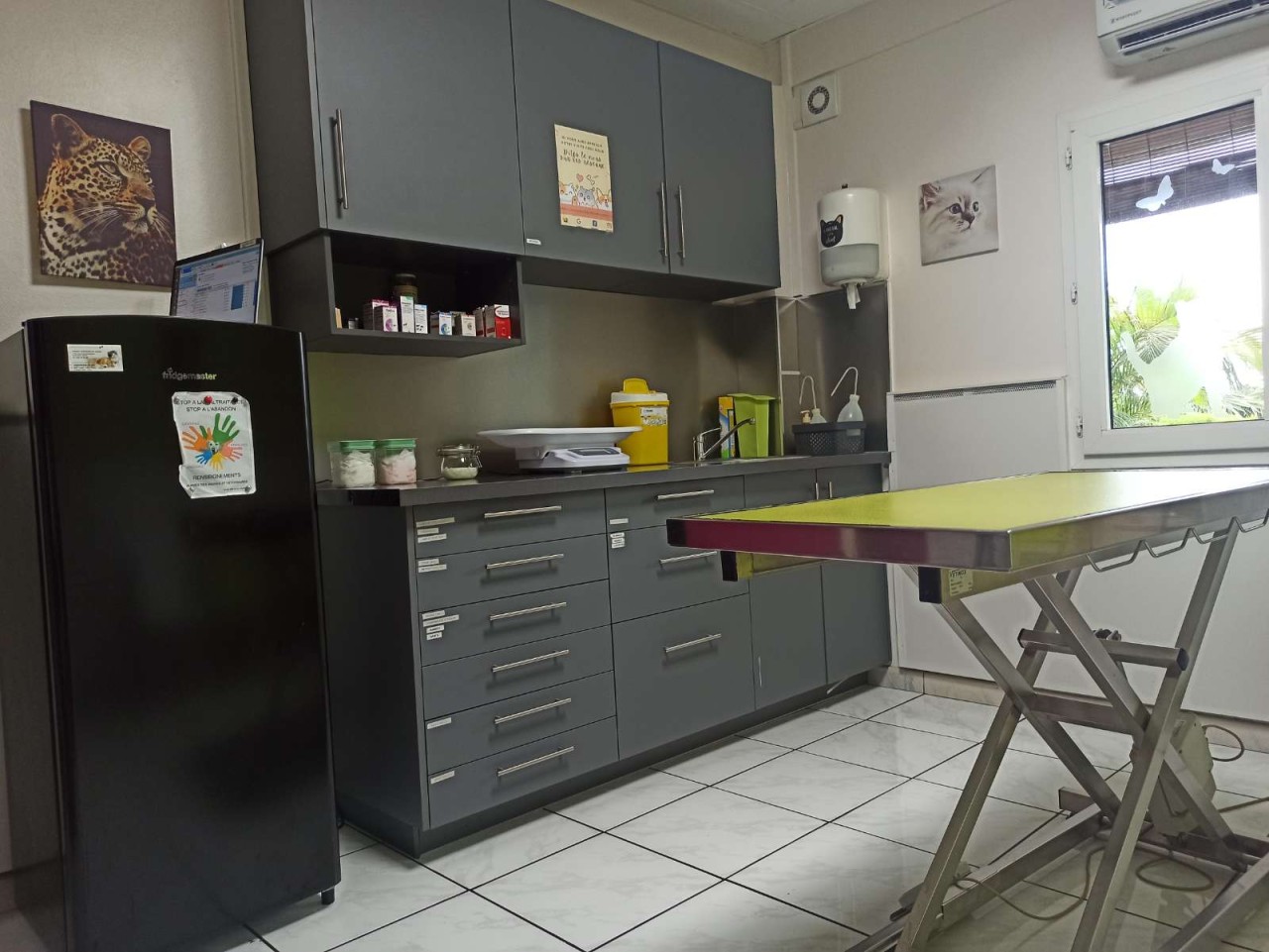 Salles : Accueil, 2 consult (chat et chien), 1 salle d'imagerie/labo, chirurgie avec anesthésie gazeuse et monitoring, 2 chenils, pharmacie.